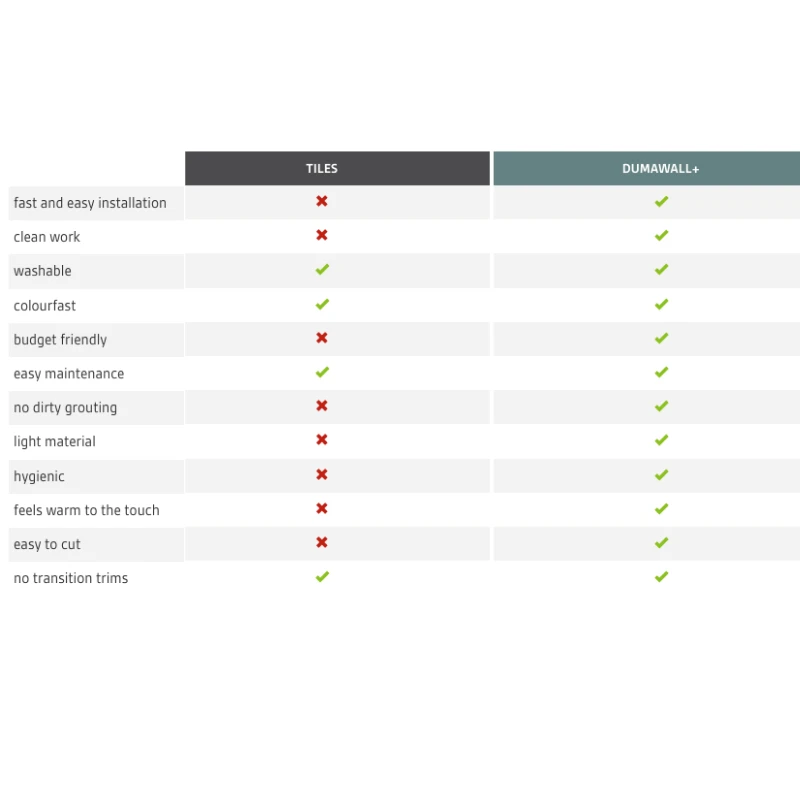 Dumawall Plus is a waterproof and watertight bathroom wall panel with a flush tongue and groove interlocking system. These bathroom wall panels are a solid core panel, and are UV-resistant. These wall panel tiles will bring an elegant finish to your indoor walls, with many style’s within the Dumawall Plus Range to choose from. Care free fitting and aftercare. Once installed your bathroom walls will emit the natural attractiveness of a genuine tiled wall.