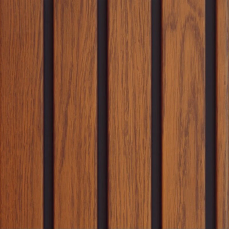 The Fronto Golden Oak V-Black panels feature bold dark grooves for a contemporary look. Mimicking premium wood, they are more durable and maintenance-free, making them a stylish and practical choice.